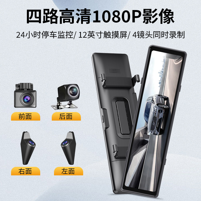 流媒体12寸DVR盲区视野4镜头1080P微光夜视后视镜行车记录